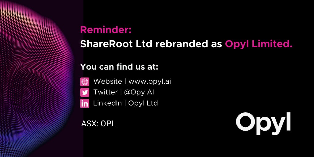 @sharerootco REMINDER: ShareRoot has recently rebranded as Opyl Limited. Join our new story at @OpylAI ! #AI #MachineLearning #socialmedia #digipharma #digitalhealth@OpylAI ! #AI #MachineLearning #socialmedia #digipharma #digitalhealth $OPL bit.ly/36dl1xg